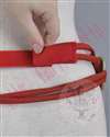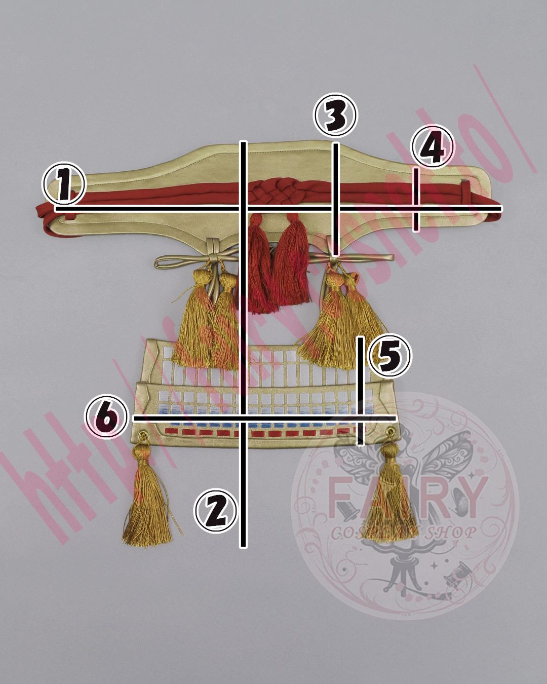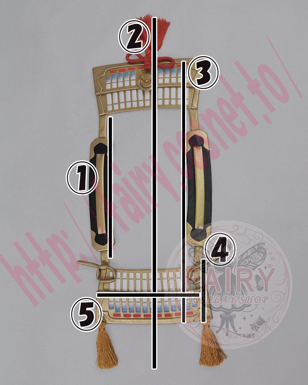 左右に切れ目がございますので、背中の赤い紐を通して金帯の内側でマジックテープを止めて下さい。