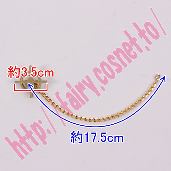 胸元の飾りはボタンとブローチ、チェーン飾りで再現いたしました。丸いドーム型のパーツは金色のボタンです。ケープ本体に縫い付けてあります。ブローチはアクリル製です。裏にあるブローチピンで固定して下さい。