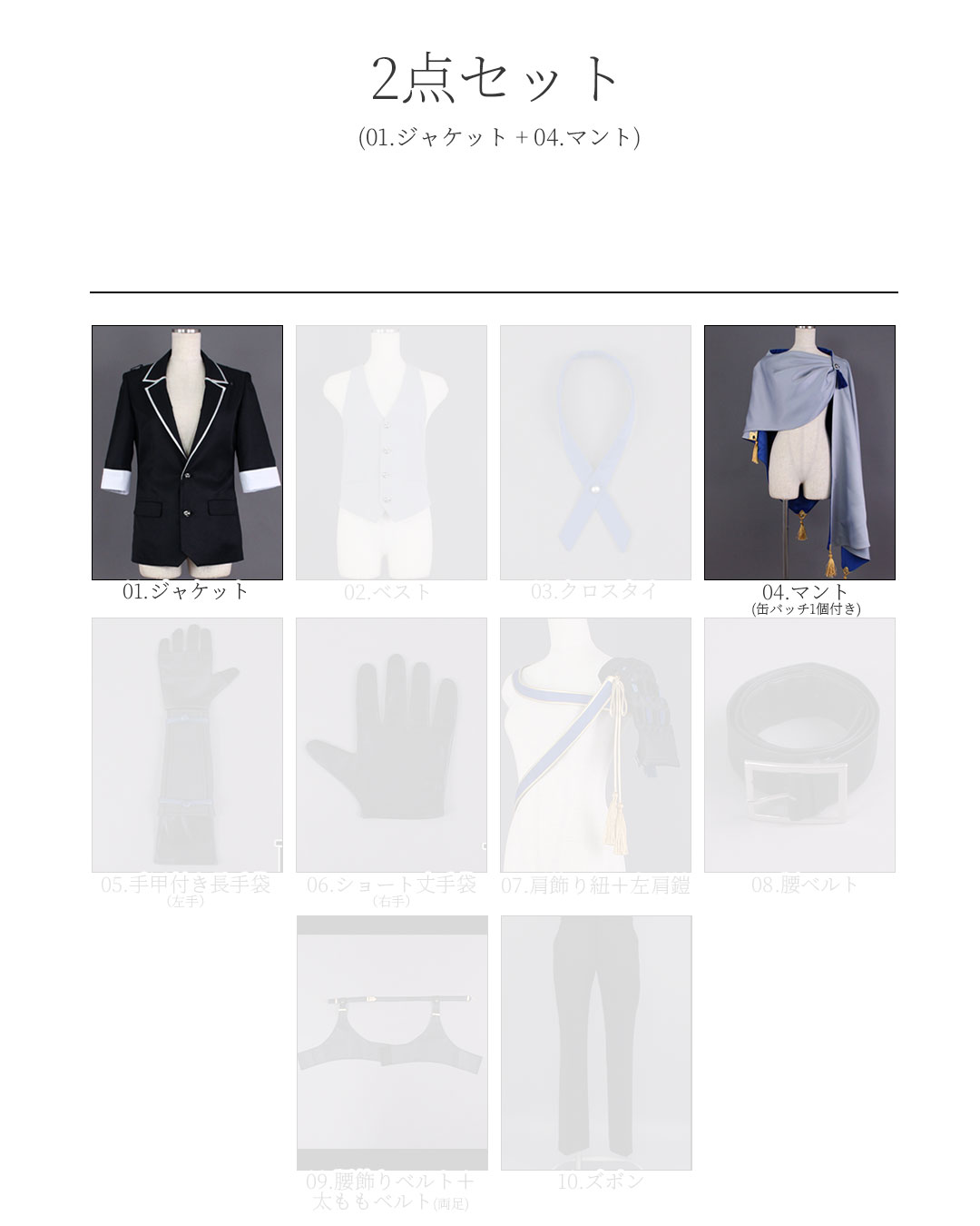 【01.ジャケット・02.ベスト・03.クロスタイ・04.マント(缶バッチ1個付き)・05.手甲付き長手袋(左手)・06.ショート丈手袋(右手)・07.肩飾り紐+左肩鎧・08.腰ベルト・09.腰飾りベルト+太ももベルト(両足)・10.ズボン】