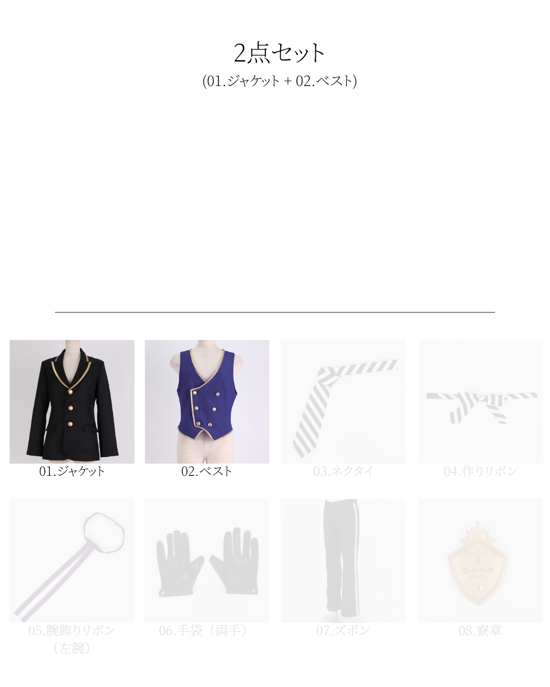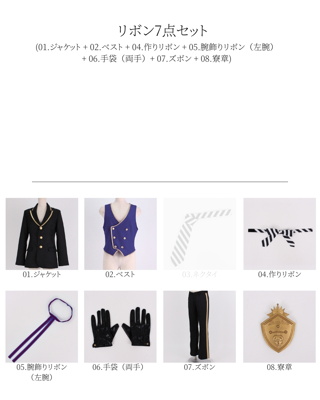 【01.ジャケット・02.ベスト・04.作りリボン・05.腕飾りリボン(左腕)・06.手袋(両手)・07.ズボン・08.寮章】