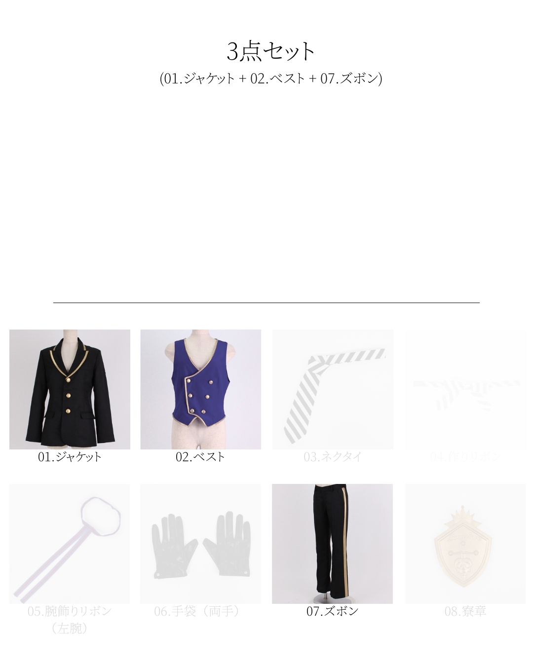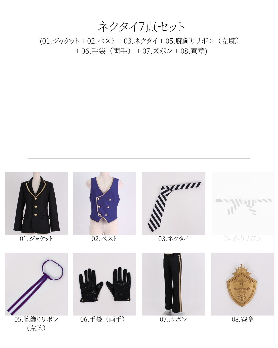 【01.ジャケット・02.ベスト・03.ネクタイ・05.腕飾りリボン(左腕)・06.手袋(両手)・07.ズボン・08.寮章】