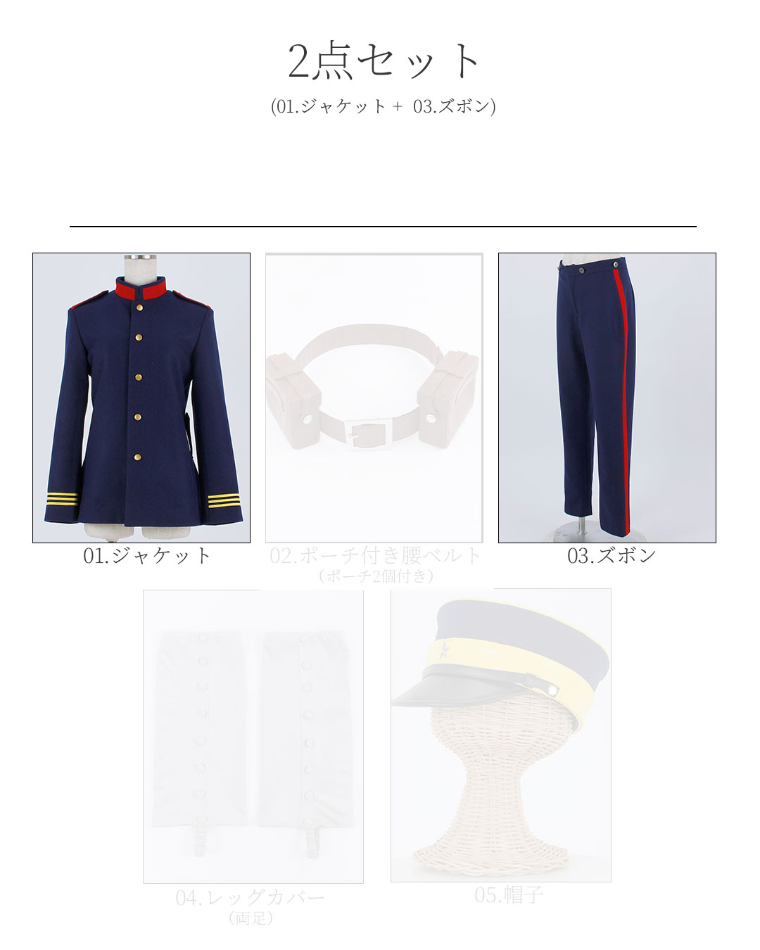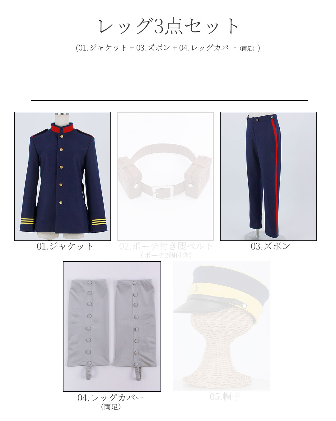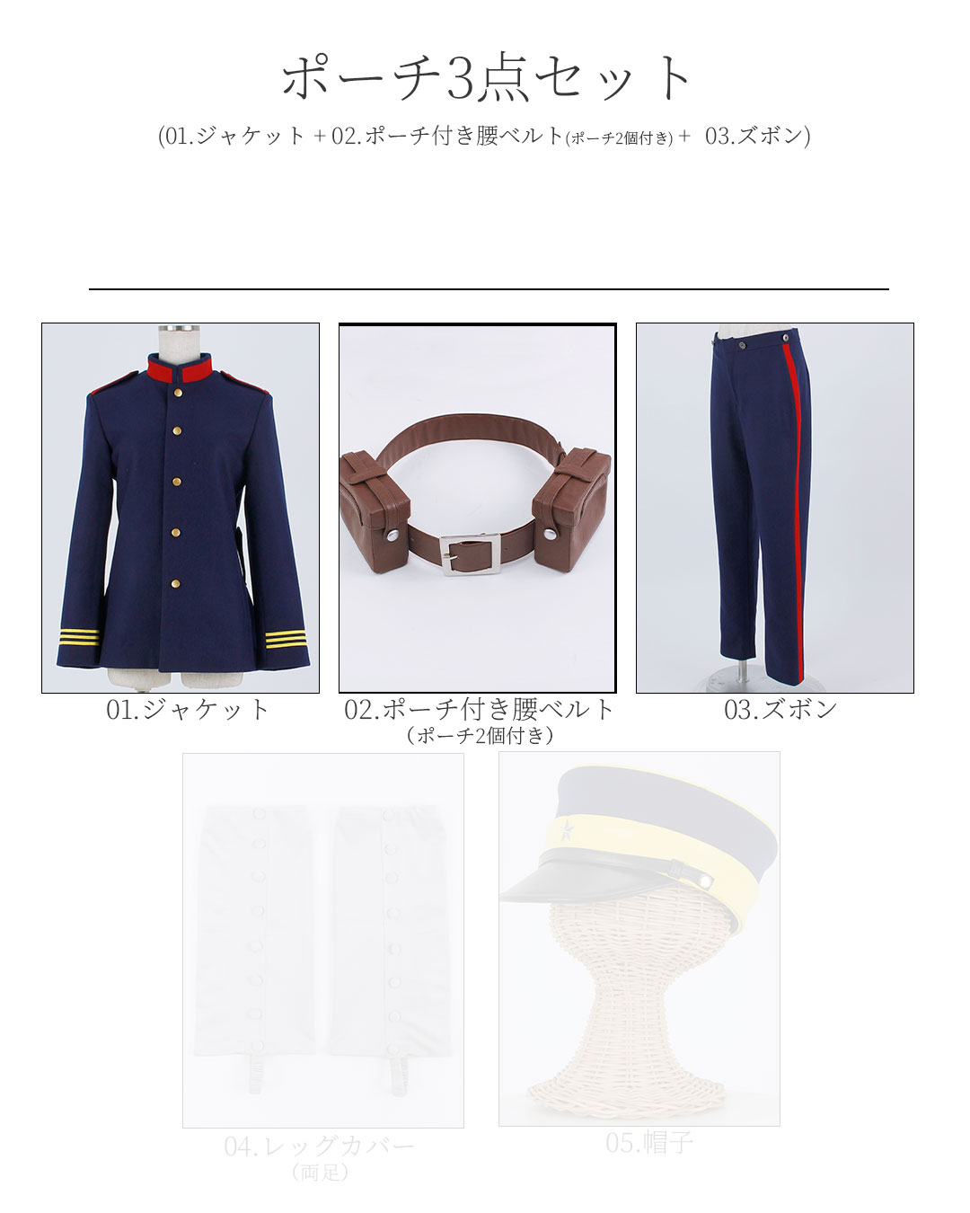 【01.ジャケット・02.ポーチ付き腰ベルト(ポーチ2個付き)・03.ズボン・04.レッグカバー(両足)・05.帽子】