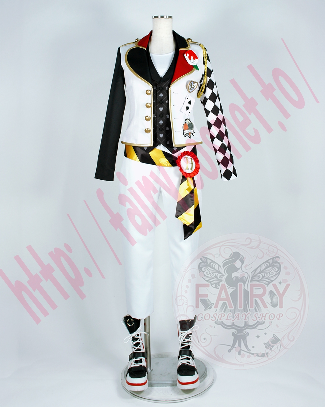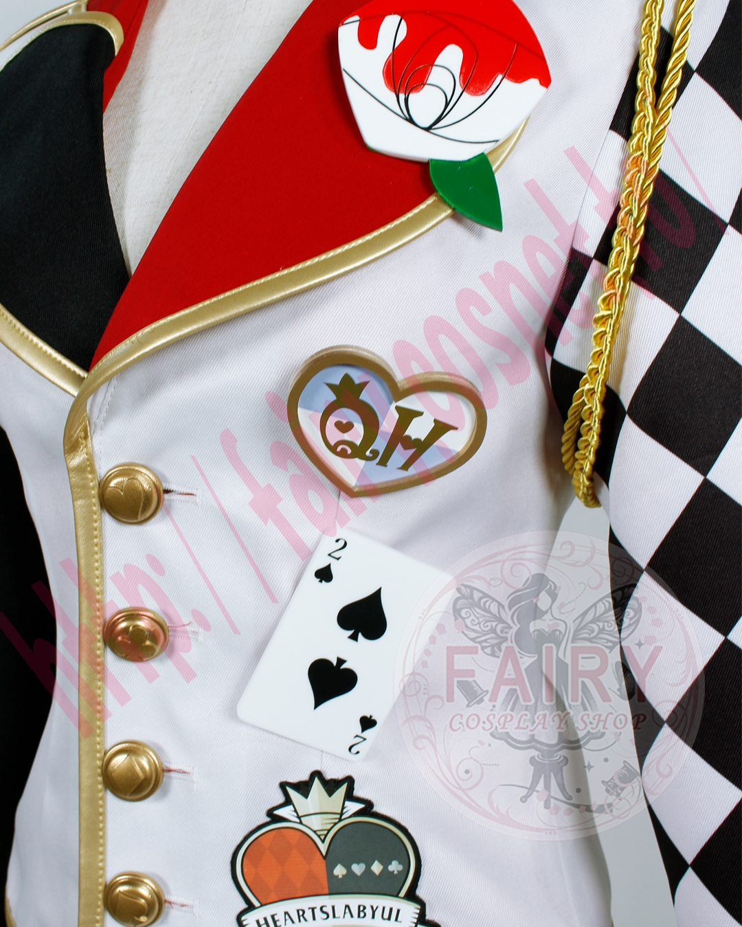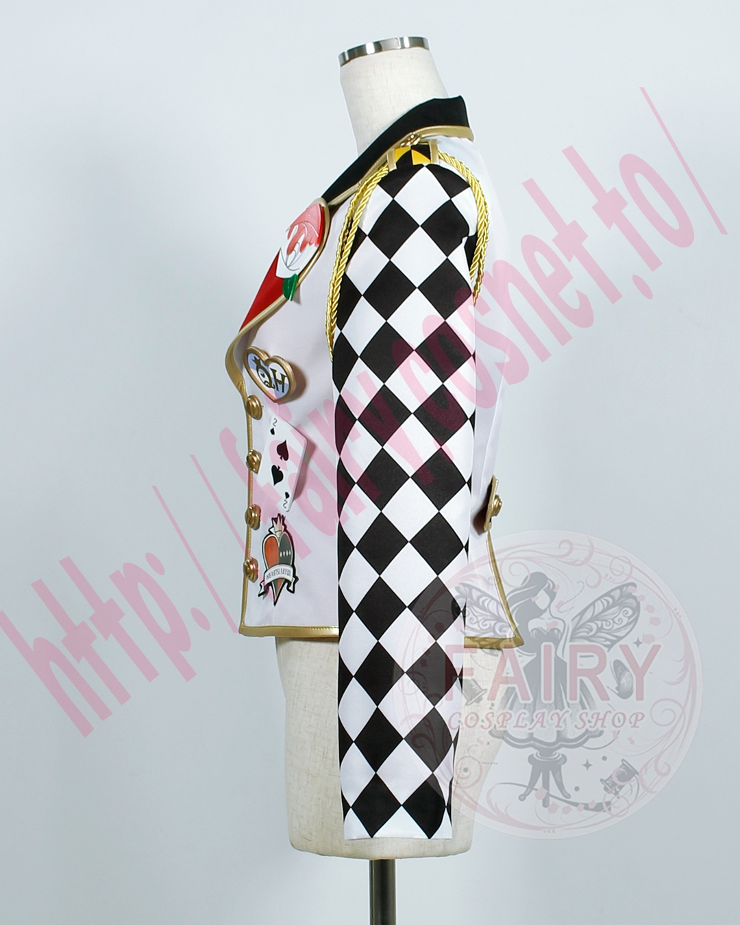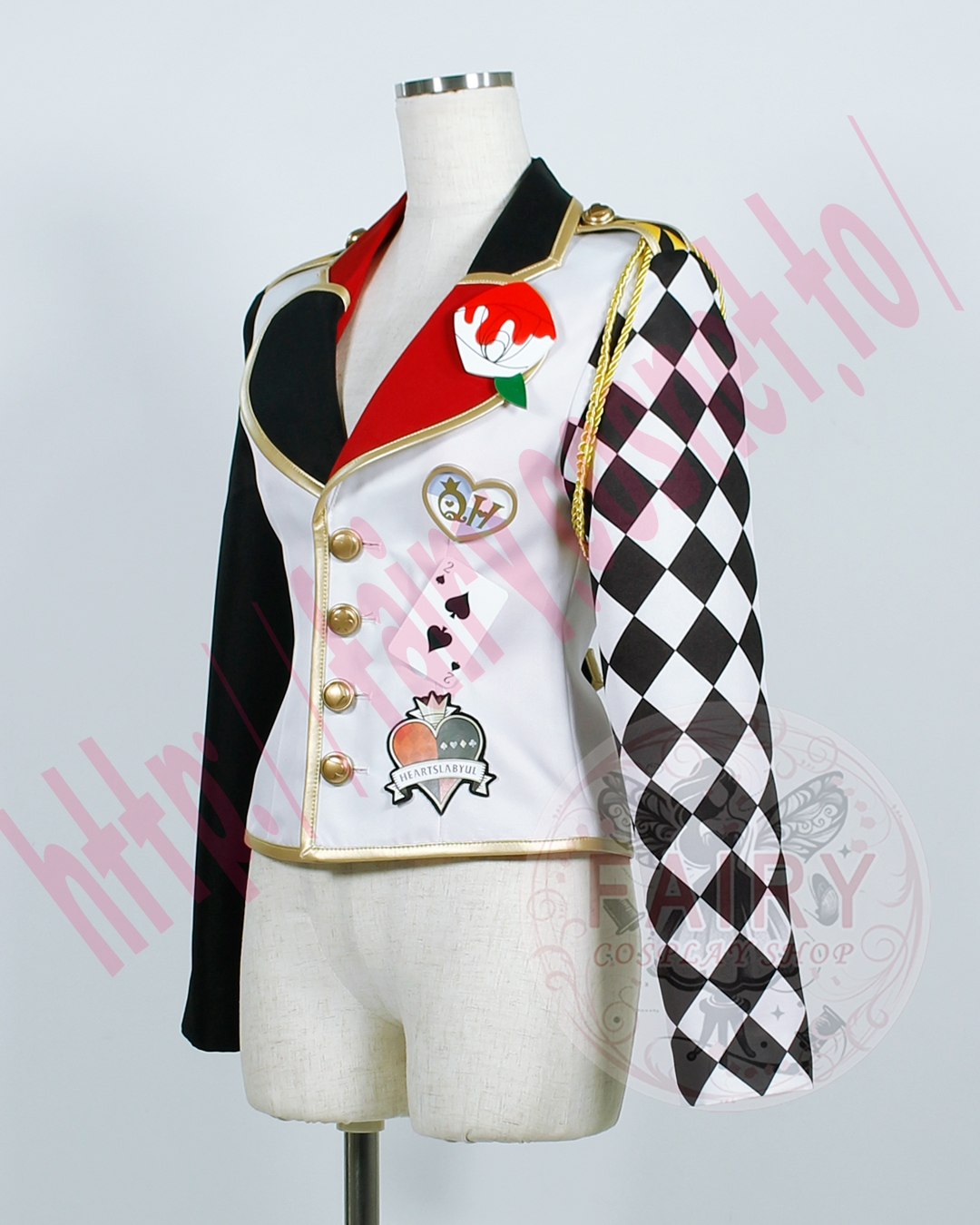 ■ジャケット(左肩飾り紐+バラバッチ+ハートバッチ+トランプバッチ(スペード)+ワッペン付き)(裏地付)ポリエステル生地で制作いたしました。