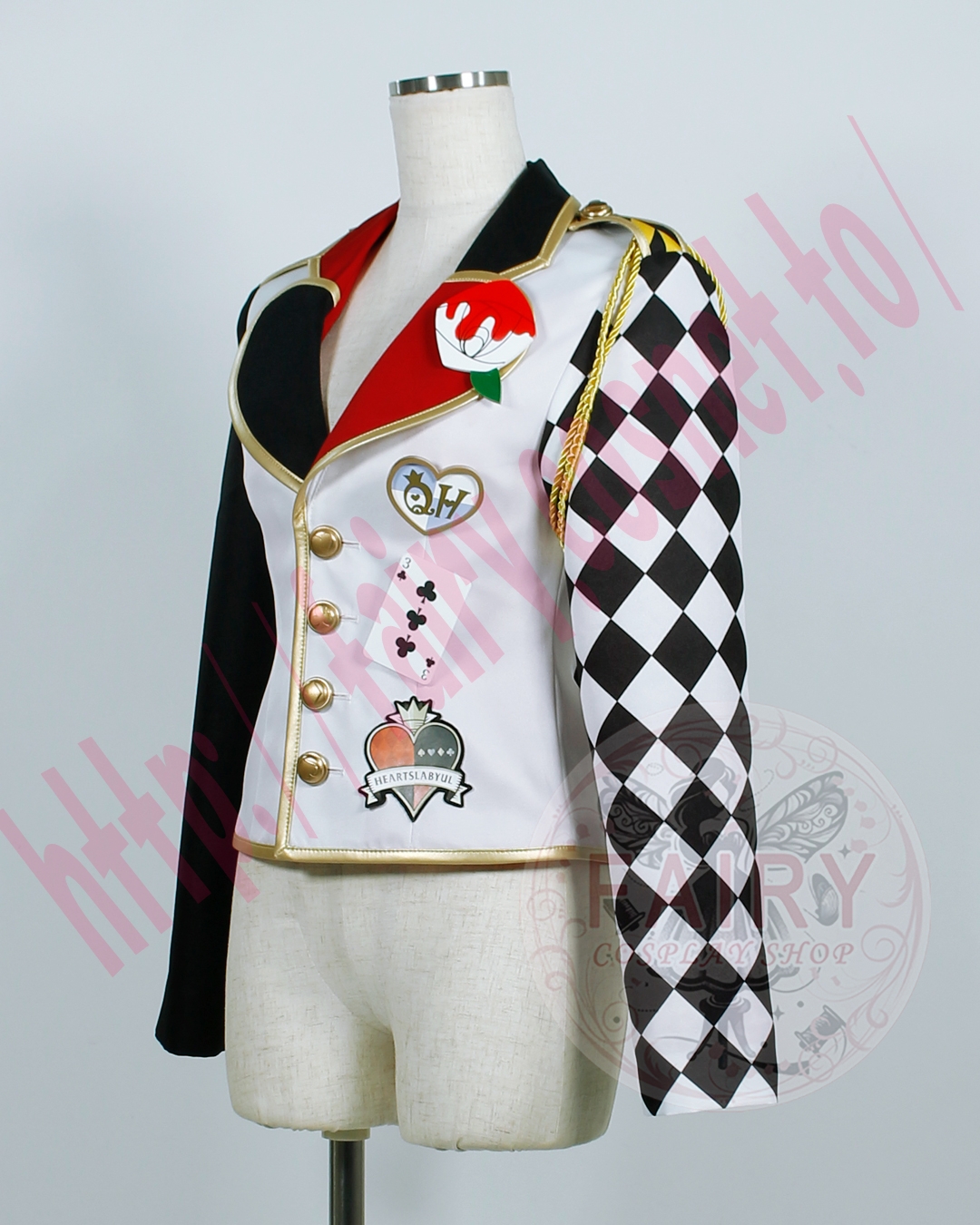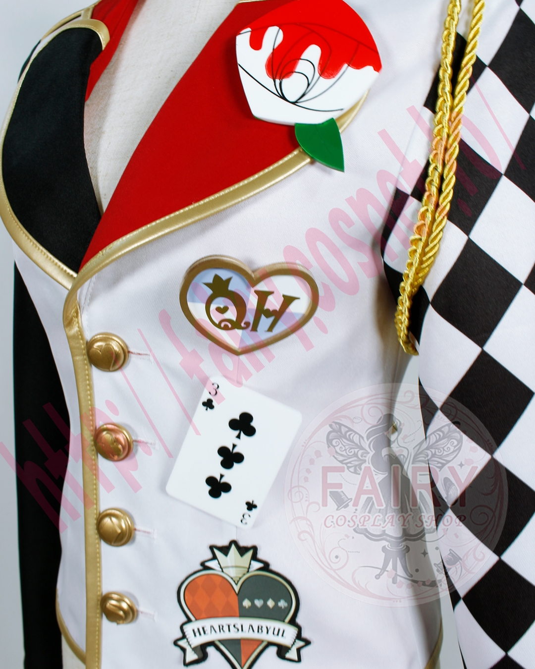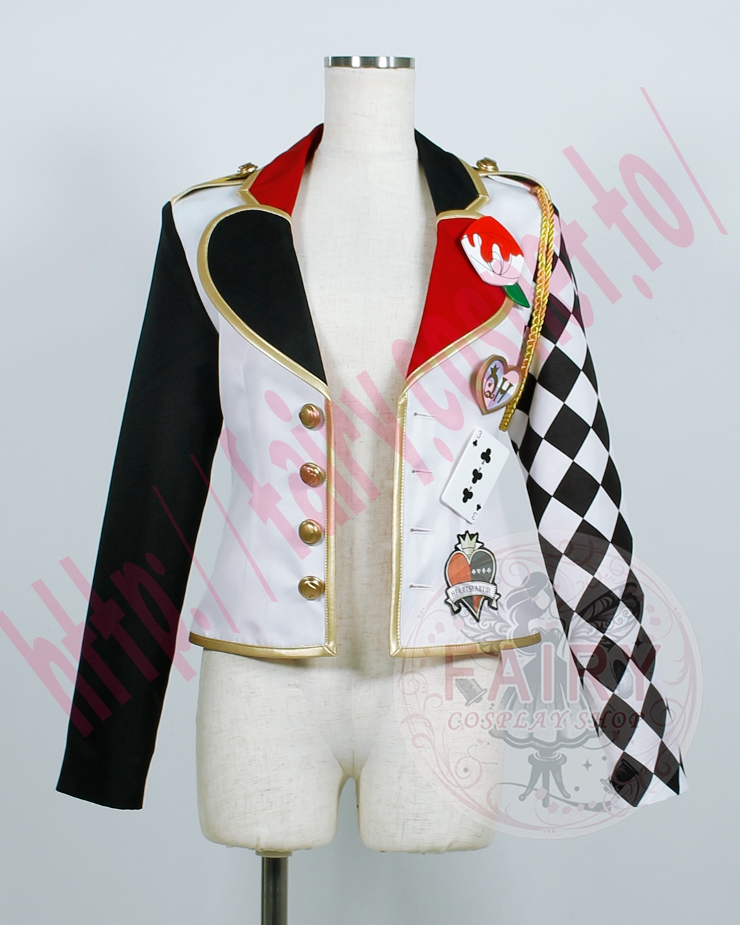 ■ジャケット(左肩飾り紐+バラバッチ+ハートバッチ+トランプバッチ(クローバー)+ワッペン付き)(裏地付)ポリエステル生地で制作いたしました。