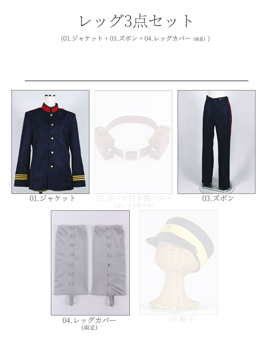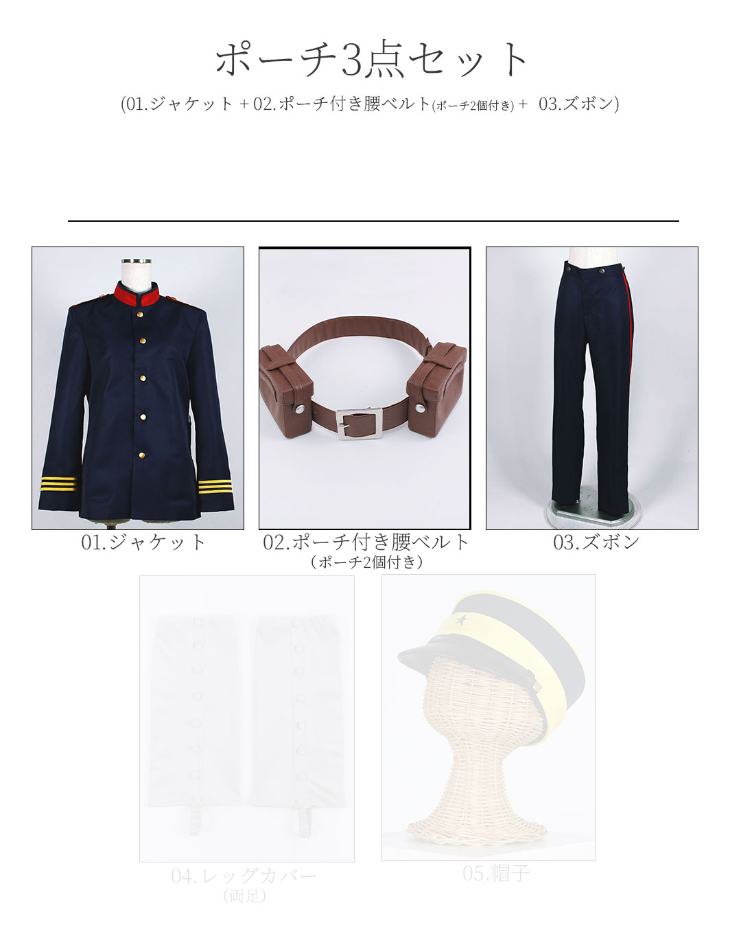 【01.ジャケット・02.ポーチ付き腰ベルト(ポーチ2個付き)・03.ズボン・04.レッグカバー(両足)・05.帽子】