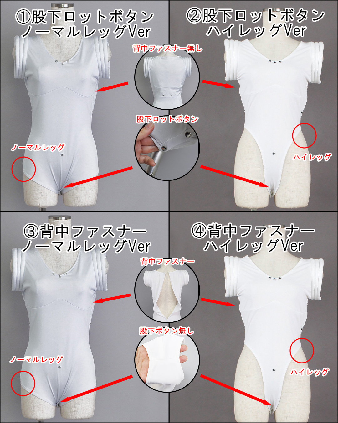 背中ファスナーで着脱、股下ロットボタン無し、ハイレグ仕様にしない。