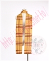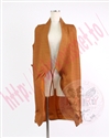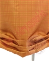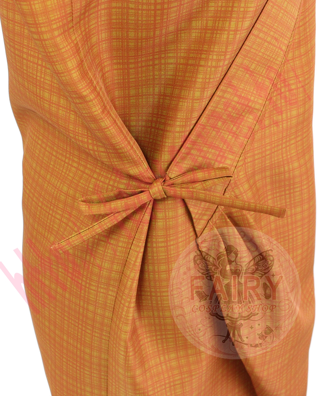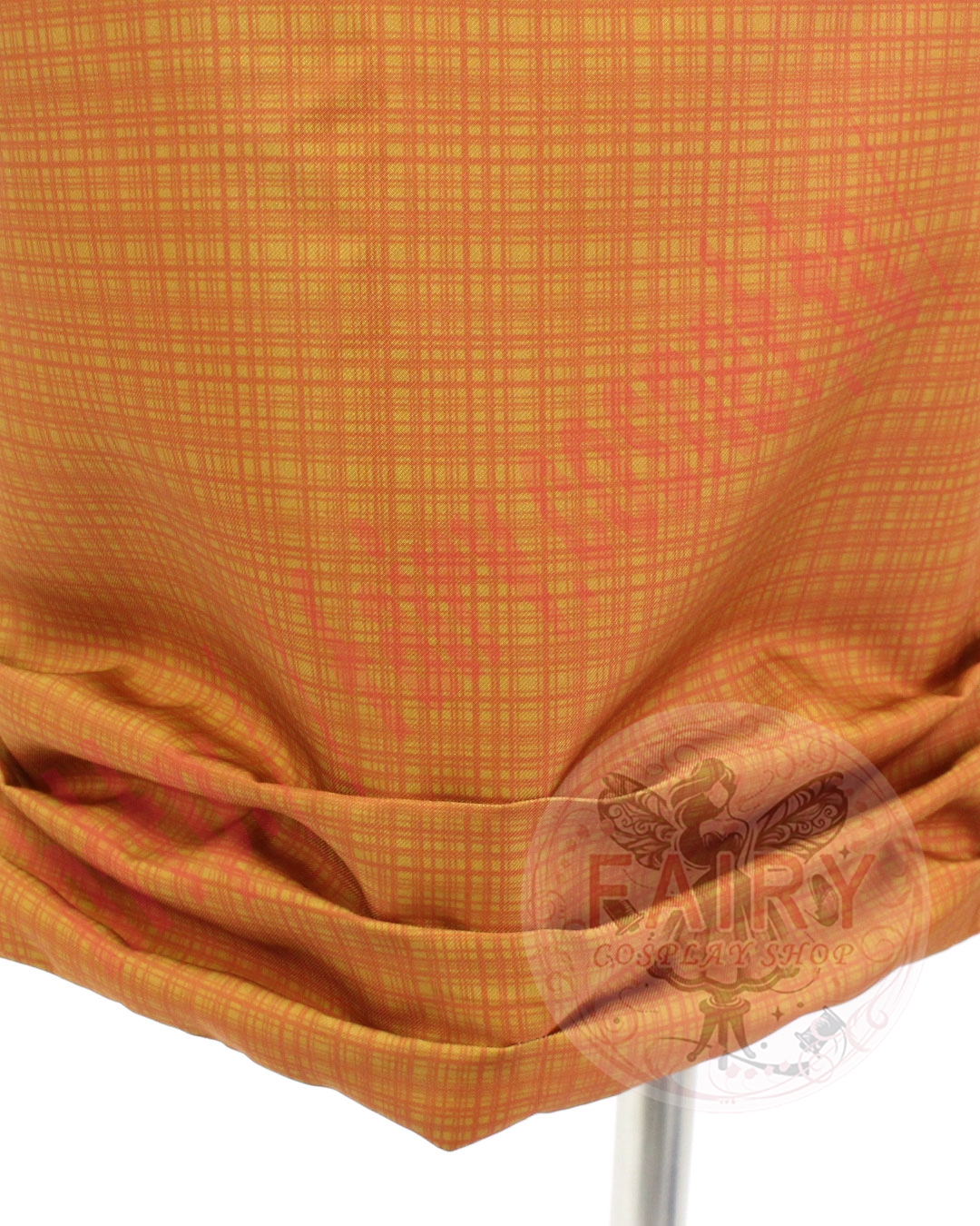 着物の柄は自社オリジナルのプリント生地で再現いたしました。色は落ち着いた山吹色にオレンジ色の格子模様です。生地はポリエステルツイル生地を選びました。