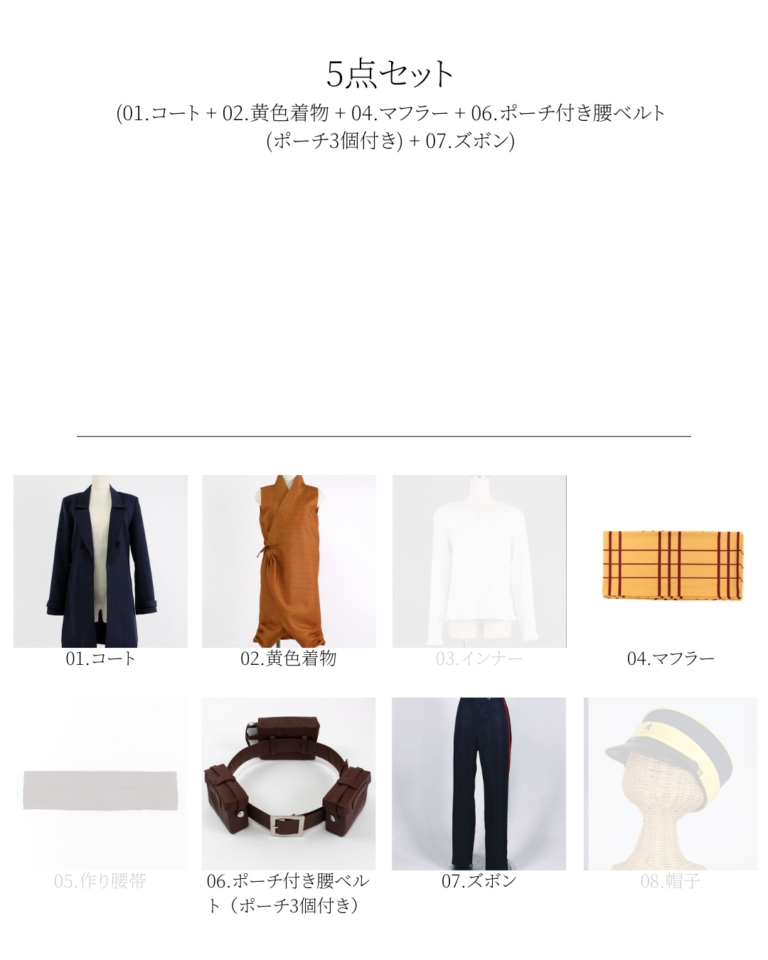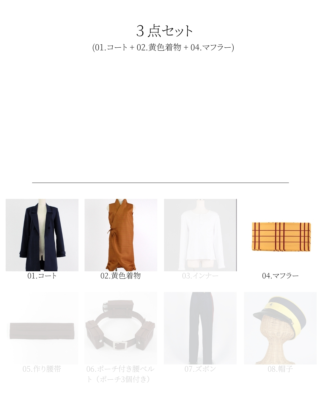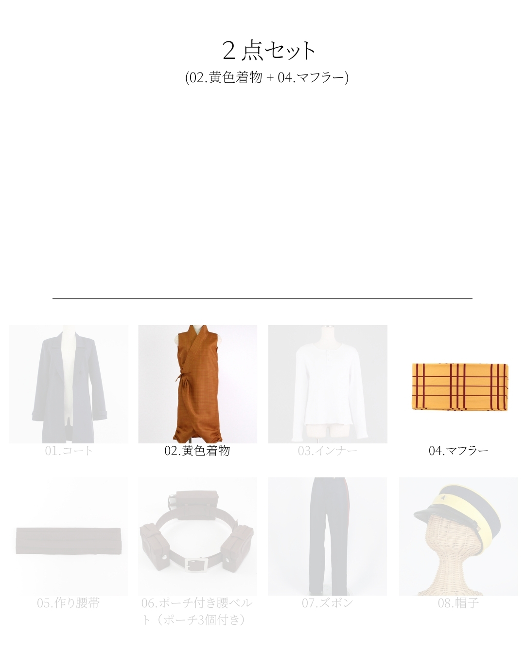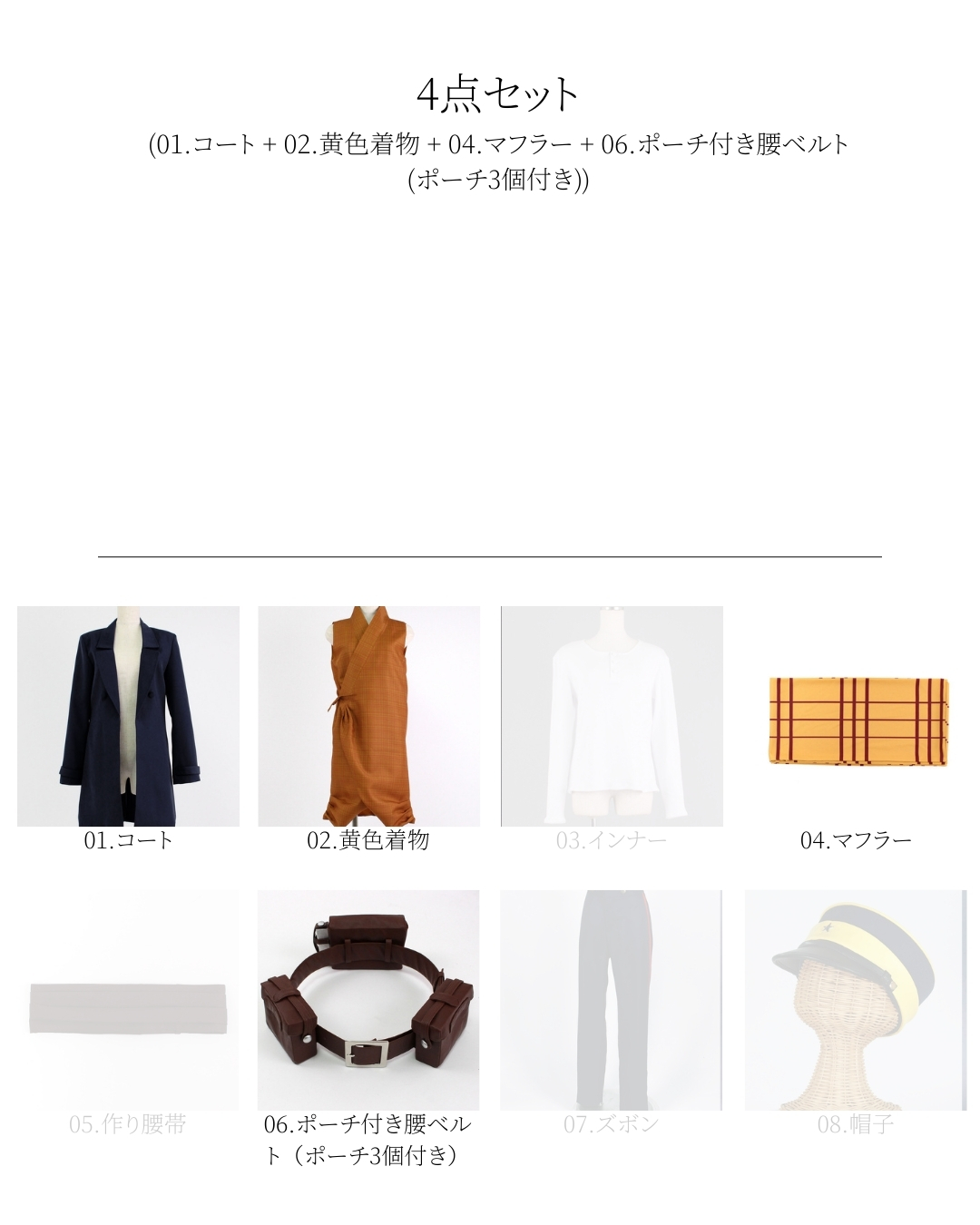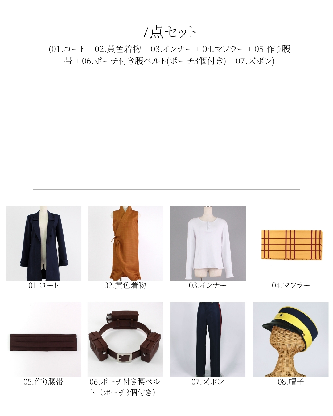【01.コート・02.黄色着物・03.インナー・04.マフラー・05.作り腰帯・06.ポーチ付き腰ベルト(ポーチ3個付き)・07.ズボン】